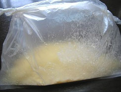 マカダミアナッツは袋に入れて叩いて粉状にします。ビニール袋に薄力粉、マカダミアナッツを入れ、空気をたっぷり入れて振り回します。