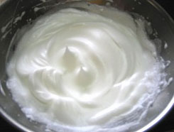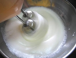 卵白に砂糖を3回に分けて入れ、ハンドミキサーで角が立つまで泡立てます。 |