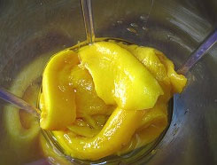 水で戻した7Dマンゴーはミキサーにかけてペースト状にします。 |