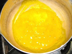 鍋にマンゴーペースト、砂糖を加えて弱火で5分ほど煮ます。火からおろしたら粗熱をとっておきましょう。 |