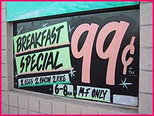隣りの窓にすんごいもんをめっけてしまいまいた!『朝食スペシャル』 玉子2個、ベーコン2枚、2スクープ・ライスで 99セント!今時のご時世、信じられないお値段です!あり得ませんてっ!