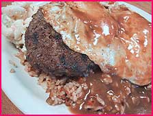 目玉焼きは両面を軽く焼いたオーバー・イージーです。100%ビーフのハンバーガー・パティも意外とジューシーです。そんで、フライドライス!これがまた、醤油ベースの濃い目の味付けがあんたんこ好みです!グレービーも濃い目のがたっぷり。た、たまりまへん!