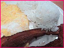 玉子2個で作ったオムレツに、カリカリのベーコンが2枚、おまけに2スクープ・ライス、これで99セントでっせ!あり得ませんて(再)!