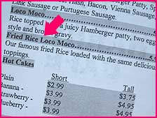 ジャジャーン!お待ちかね、ごっつーウマい秘密のメニュー、『フライドライス・ロコモコ』! $5.95。