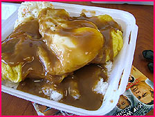 えっとですね、こちらはローカルフードの中でもかなり珍しいアヒ(マグロ)のロコモコでありますな。ライスの上に、巨大アヒのフライ、そして目玉焼き。濃厚なコクのあるグレービーソースがたっぷりでございます。付け合せは、もちろんマカロニ・サラダ。