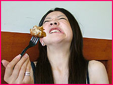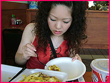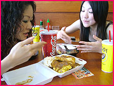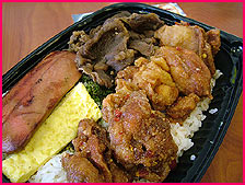 カライ弁当ってホンマに辛いんですわ。激辛のフライド・チキンにビーフ・テリヤキ、玉子焼き、フランクフルトがついとります。辛いもんフェチのあんたんこにはこたえられない逸品です。