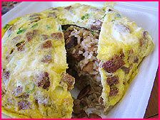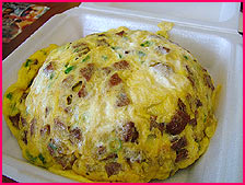 フライド・ライスを包み込む薄焼きオムレツには、ソーセージやらピーマンやらの具もタップリでございまして、フライド・ライスと絡めて食べると最高なんですわ、これが。味濃い系のあんたんこは、上からケチャップをかけて食べるが好きだったりするです。 |