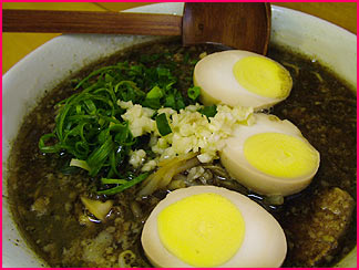 そして、あんたんこ版 『いつもの!』 にする場合のトッピング料金ですが、、、タレ濃い目(無料)、背脂多め(無料)、麺バリカタ(無料)、刻みにんにく(無料)、焦がしにんにく油(無料)、味玉追加($1.00)、辛ネギトッピング($1.00)となりますです。ちなみに、味玉らーめんさんに行って