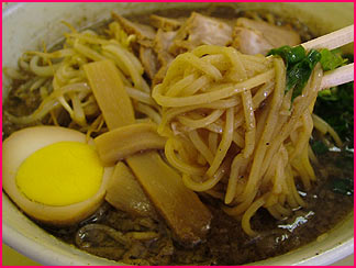 で、麺のクローズアップです。麺に絡むスープの艶をご覧いただけますでしょうか。